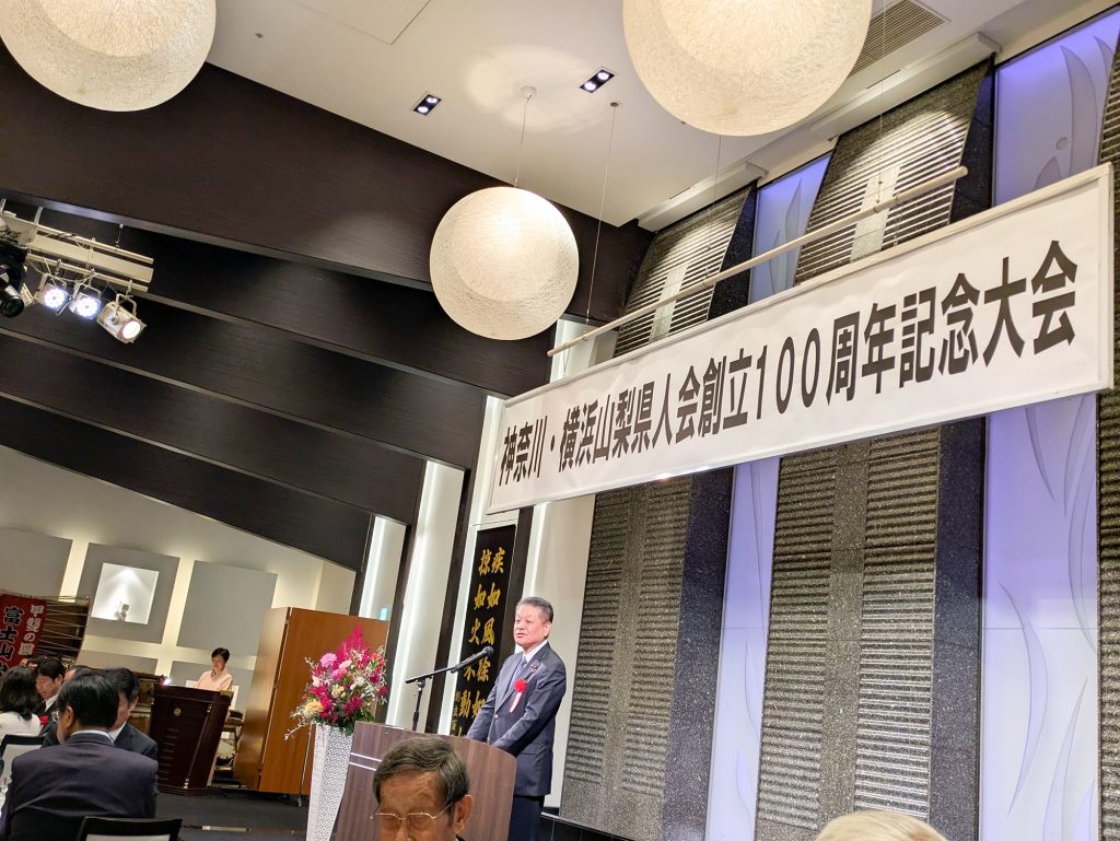 生憎の雨の日曜日。 横浜で開催の「神奈川・横浜山梨県人会創立100周年記念大会」であいさつをさせていただきました。