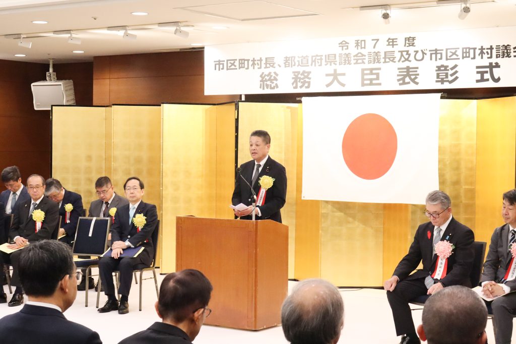 令和7年度 市区町村長、都道府県議会議長及び市区町村議会議長 総務大臣表彰式に出席し、地域社会において永年にわたり地方自治の発展と住民福祉の向上のため尽力されてこられた皆さまに、参議院総務委員会を代表して祝辞を述べさせていただきました。